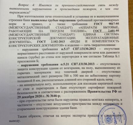 «Отметим, что сам факт несоответствия каких-либо из указанных параметров нормативным требованиям еще не является доказательством причастности печи к возникновению пожара».