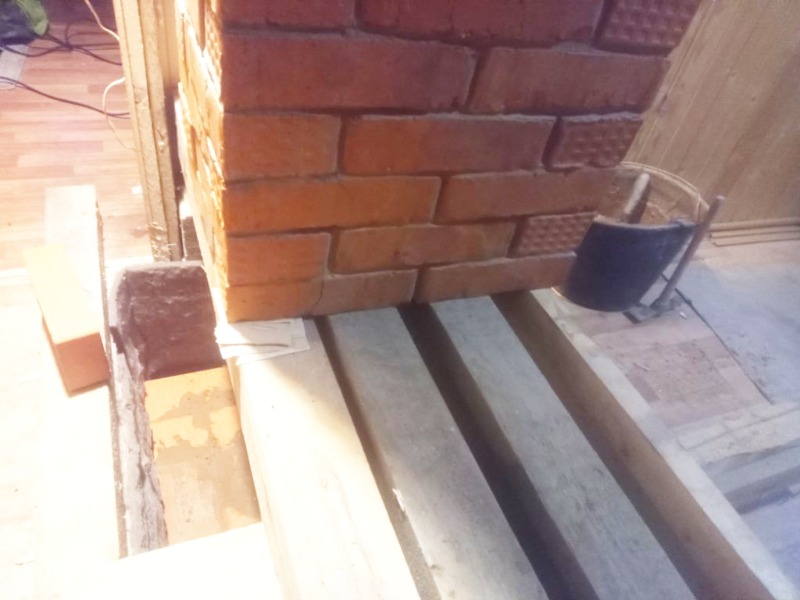 В данном случае перегородка - это капитальная стена, упор на нее и балки на полу. Выпиливать аккуратно, ни в коем случае не выколачивать! Решено было упереть на два новых бруса 150 на 100, по бокам просто страховка пока снизу работаешь.