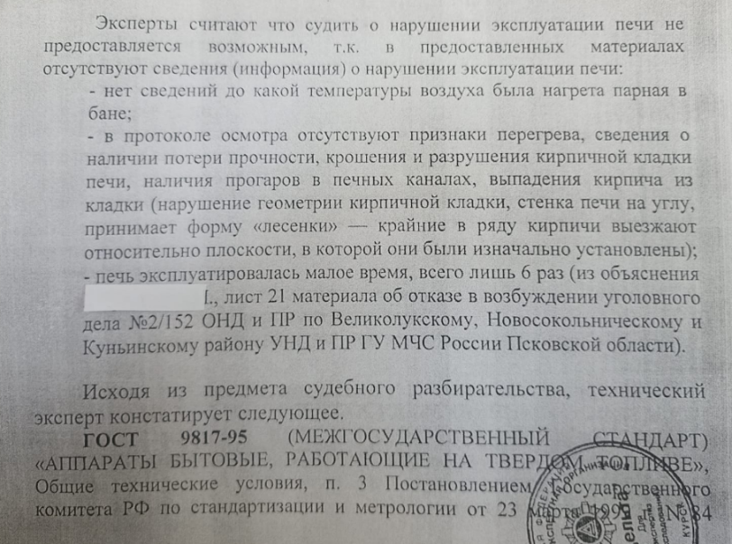 «Отметим, что сам факт несоответствия каких-либо из указанных параметров нормативным требованиям еще не является доказательством причастности печи к возникновению пожара».
