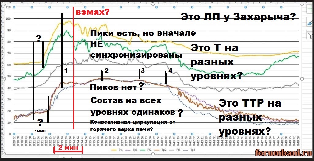 Графиков много даже сюда выкладывал. Расстояния между датчиками на шапке известны между 1-м и 2-м около 20 см. Второй логгер с 4-м датчиком обычно у ног размещаю. Если сижу, то от него до 2-го датчика около 96 см. С линейкой не хожу, чтобы ещё и расстояние до потолка везде замерять. Вениками обычно парюсь стоя на нижнем полке или топчане. Pt100 и 1-й датчик в таких случаях буквально в нескольких сантиметрах от потолка могут быть.
