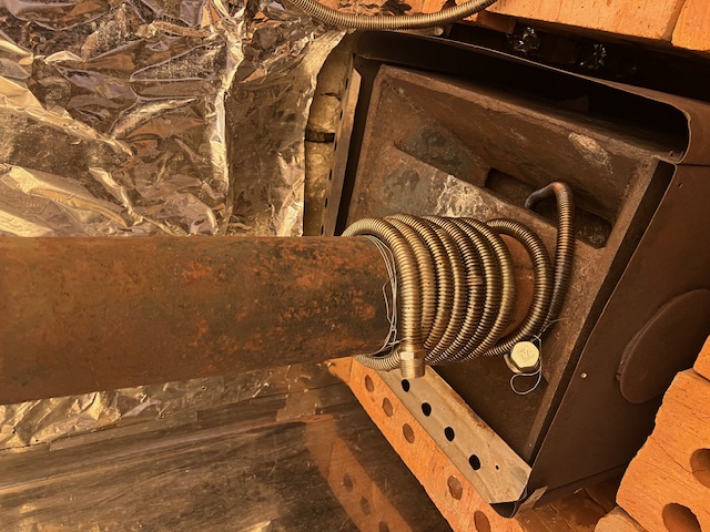 Да, в гофре кипит, пока по ней течет. Путь длинный, 10м. Не каждая капля до конца докатится. В Конце пути затычка. Через дырочки диаметром 2 мм в гофре пар выходит. На камни что-то попадает и догревается. Во всяком случае пока выйдет за пределы кирпича ни каких капелек не будет.