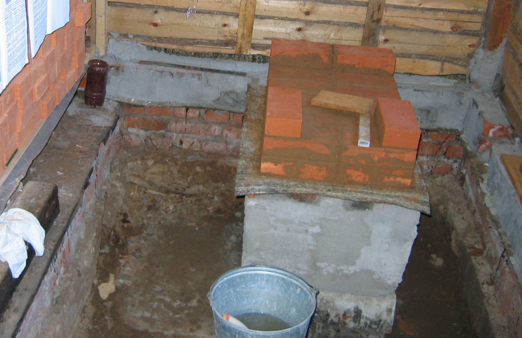 Поэтому я делая фундамент за ТРИ ряда кирпичей до пола проложил слой битого стекла изолировав низ фундамента от конструкции печи. Пришлось все бутылки в округе собрать, и кинескоп от телевизора туда же использовать. Посчитал рубероида для влаго изоляции может и достаточно, а теплоизоляция не помешает.