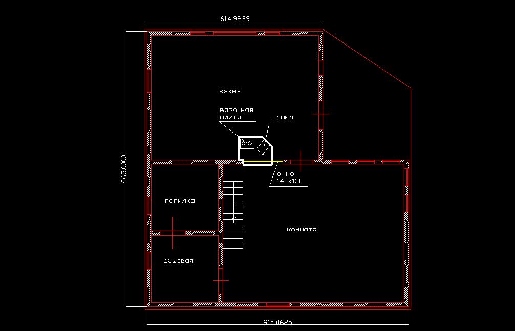 В место окна (желтого цвета на плане) требуется врезать тепловой щит для обогрева дома. Если есть возможность, то топку развернуть на 45 гр, чтобы видеть как горит огонь. По моим расчетам печь должна быть около 5кВт.