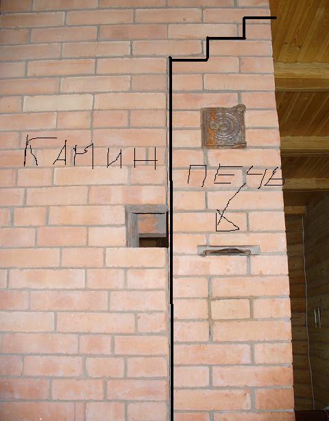 Камин примыкает к печке... Если смотреть на фото, то он слева... - там шов в кладке практич. на всю высоту. Общая кладка начин. выше, там где дыможод печи соедин. сосновным дымоходом камина - см. фото.