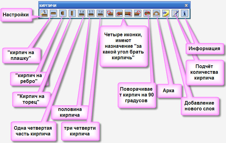 Является отдельным элементом построения и стоит в одном ряду с такими мощнными инструментами программы «Кирпичи», как точки привязки. Представлено только одной кнопкой, однако функций у этой программы очень много, так как может рисовать 6 видов различных арок.