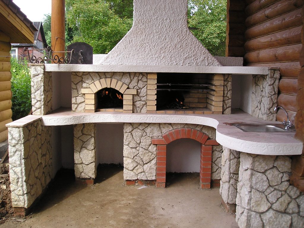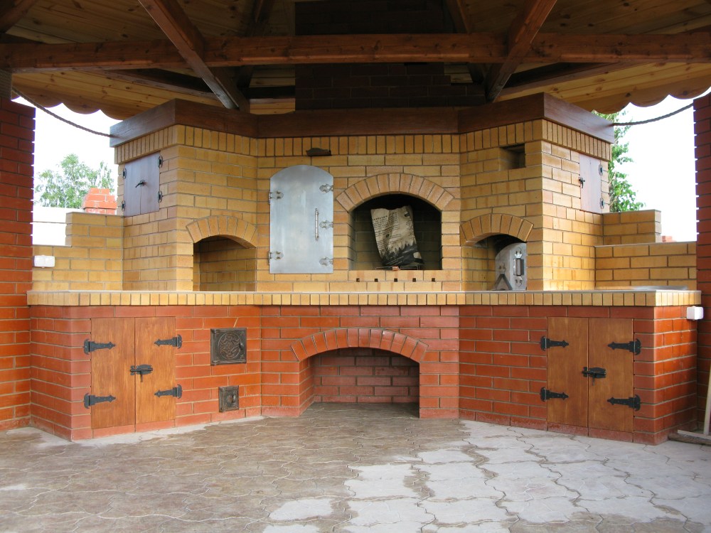 Уличный кухонный комплекс : варочная плита + русская печь + шашлычница +столешницы + рукомойник + ниши под дровеницы ...