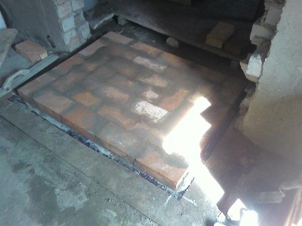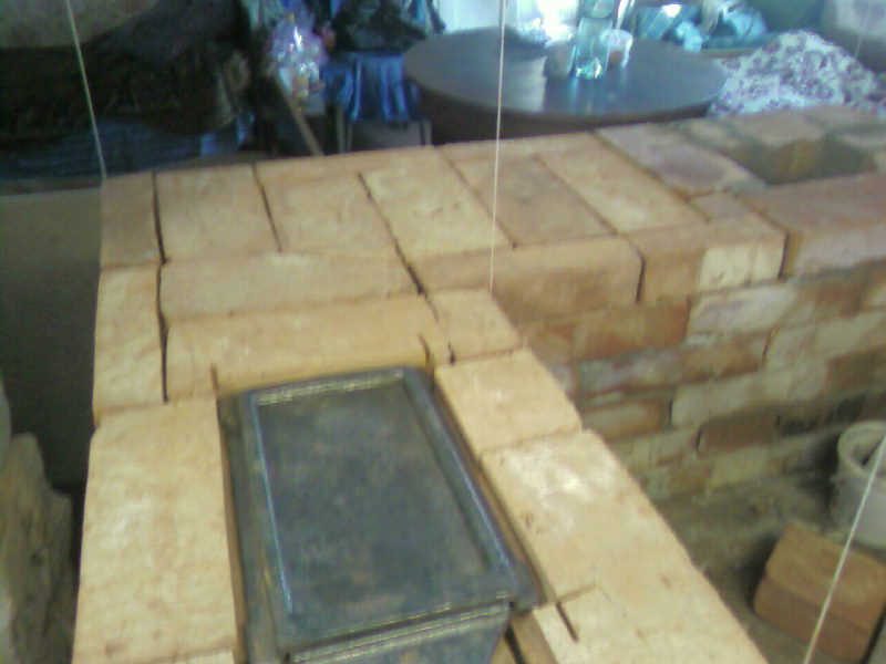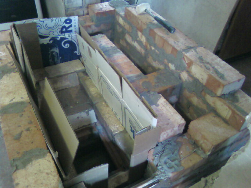 Две стенки из красного кирпича будут служить утеплителем. Основание склеить на мастику, прогреть для закрепления, уложить на базальтовый картон. Перекрытие тоже склеить заранее. Есть вариант сделать его куполом.