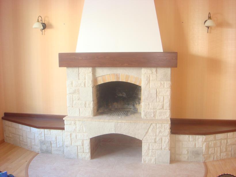 Кирпичный камин, облицовка известняк с Жигулевских гор, с верху деревянная балка, дымосборник обшит ГКЛ.