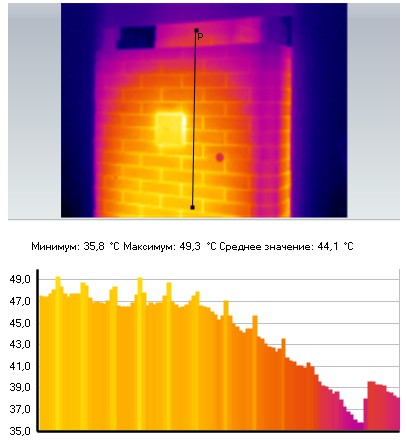 Еще, если посмотреть на температурный профиль, то бросается в глаза то, что на кирпиче т-ра меняется плавно, а при переходе на материал шва просто скачкообразно - на 10 С моментально. Вряд ли так может быть в реальности. Скорее из-за материала (или углубленности) шва. Хотя опыт с термопарой показывает разницу 8 С ....??? Не ясно.