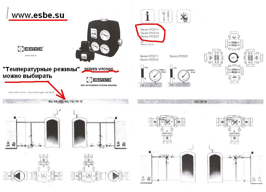 На фото - схема подключения 3-х ходового термостатического смесительного клапана ESBE series VTC500. Сайт производителя WWW.ESBE.SE
