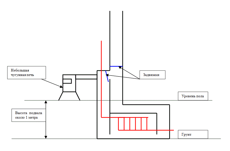 Высота подвала около метра. А в комнате хочется иметь красивенькую чугунную печку. Идея в том, что чугунная печка быстро разогреет помещение, а теплоаккумулятор (в подвале) обеспечит теплую ночь.