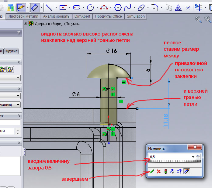 Поставим размер между шляпкой заклепки и верхней кромкой петли и вобьем значение 0,5мм. Мы сейчас сотворили связь между разными деталями, причем деталь рамка является ведущей, а заклепка ведомой. При изменении положения верхней грани рамки, шляпка заклепки последует за ней, обеспечивая зазор 0,5.