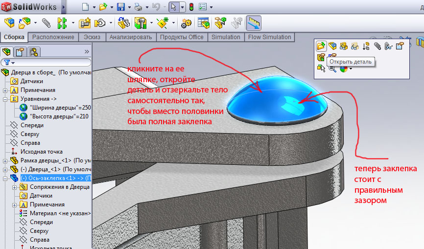 Мы могли бы поставить размер высоты шляпки от центра заклепки просто открыв деталь Ось-заклепка, но тогда бы нам предварительно нужно было бы вымерять зазор между петлями и вычислить наш размер, но зачем нам трудности, когда представляется возможность сделать это естественным образом Smile .