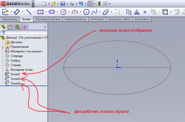 Скрываем опорный эскиз и отображаем два рабочих рис.82.