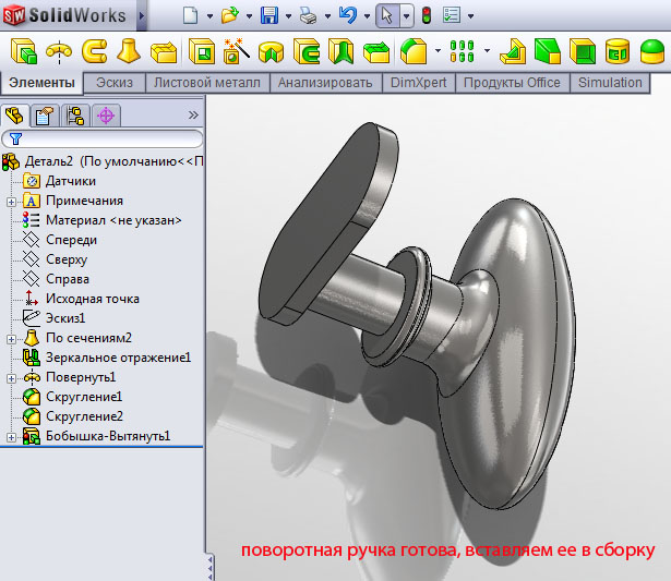 В плоскости Сверху рисуем эскиз оси ручки рис.86. Переходим на вкладку элементы и проворачиваем эскиз по осевой.