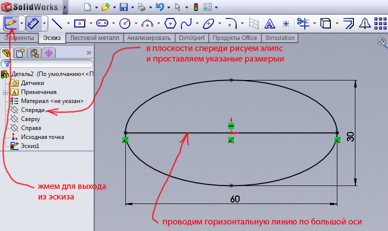 Теперь разворачиваем ракурс в изометрию и создаем эскиз в плоскости Справа рис.81. Рисуем элипс, как показано на рисунке, проводим осевую, ставим размер малой оси элипса, отсекаем нижнюю его часть. Выходим из эскиза.