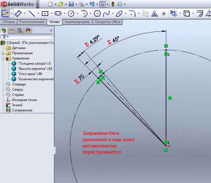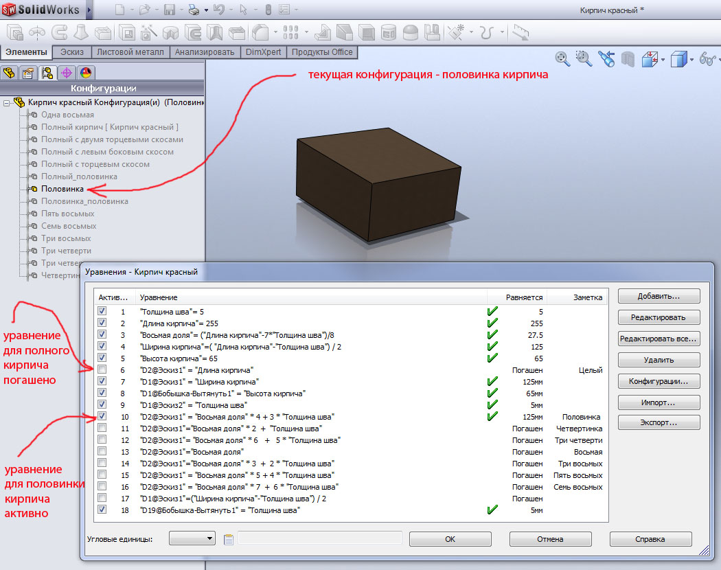 Анд-рей, пока Вы не приступили к очередному чугунному шедевру, хотел бы Вас вернуть к к кирпичам, и прояснить один момент. Суть вопроса:В менеджере кофигураций Вы создали все нужные формы кирпича и объявили, что они все связаны уравнениями. Но все уравнения