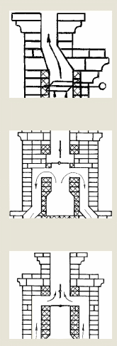 Окончательный вид каминопечи зависит от ее расположения в помещении, а также габаритных размеров предназначенной для нее топочной фурнитуры заводского изготовления. Так, максимальный размер типовой распашной рамки (48 х 48 см) определяет и небольшие размеры портала. Топка сооружения имеет зуб, дымосборник, задвижку. В каминном прямом дымоходе установлена еще одна задвижка, выше первой на 2–3 ряда кирпичной кладки. Между этими задвижками расположены два поворотных дымоходных канала: один уходит в левое крыло (тепловой щиток), а второй — в правое крыло каминопечи. Через эти каналы проходящие по ним горячие дымовые газы нагревают боковые стенки — двухоборотные тепловые щитки.