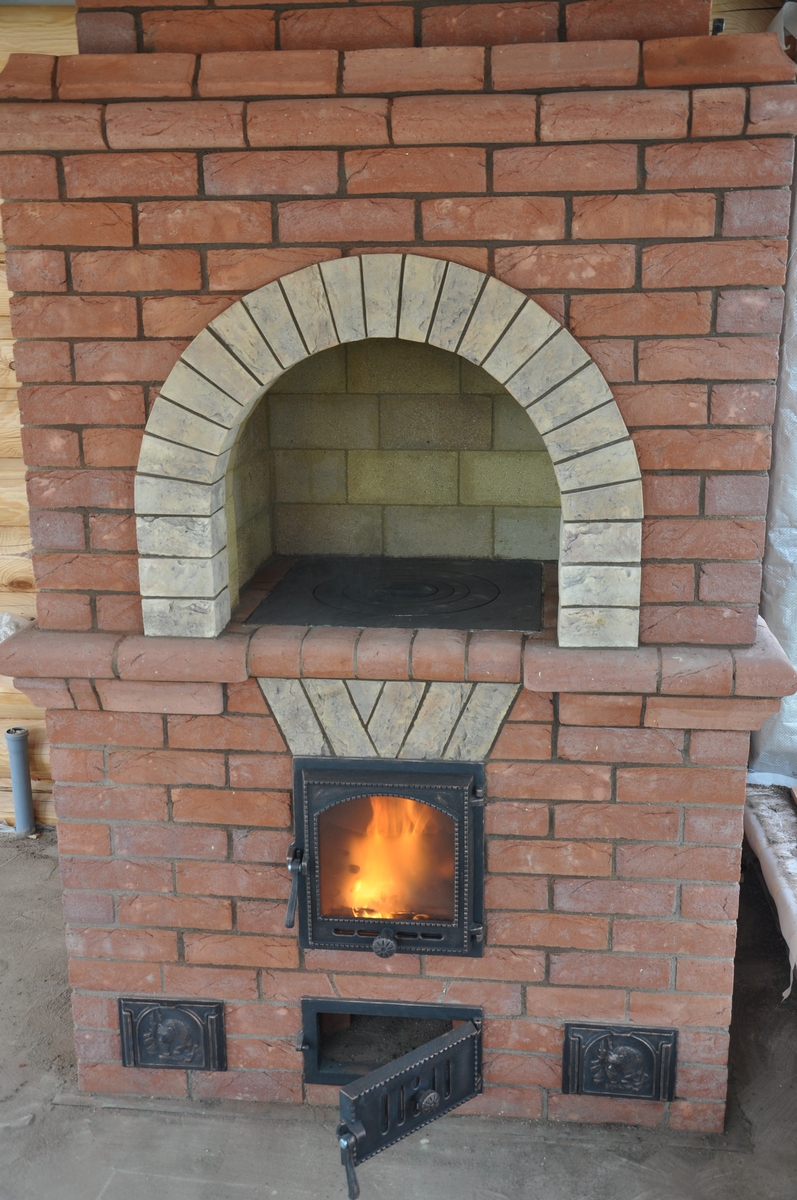 Вот решил решил построить барбекю и под ним вместо дровницы печь. Получилось!!! Справа небольшой колпачек получился, а над ним выход из вытяжки. Когда готовлю в барбекю, то круги с плиты снимаю и вместо них кладу колосники.