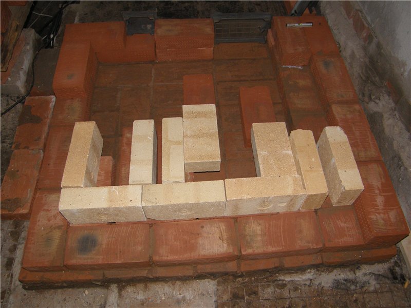 первый ряд положил почти ) кроме двух кирпичей рядом с дверкой зольника пилить надо ...
