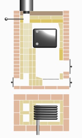 Перекрытие, я нарисовал, из шамотных плит(ША94), но можно сделать и обычным шамотным кирпичём, напуском. Завершение, из керамзито-глино-бетона, армированного проволокой Ф2мм.