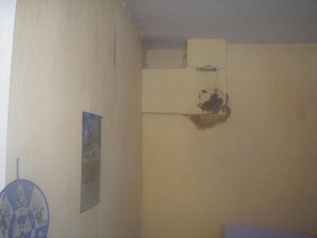 Слева в стене отопительный щиток. Вверху видно выход из него непонятного изгиба.