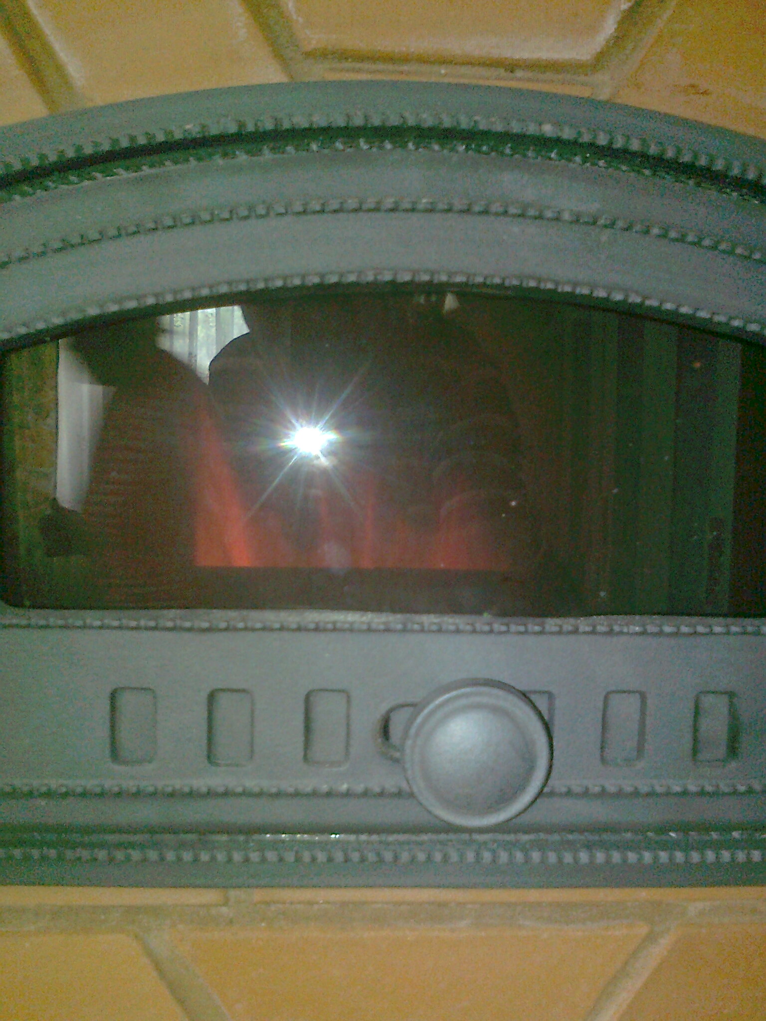 Заложил немного дров. И, конечно что-то стало страшновато. Поэтому пламя все время держал средним. Так что и закоптилось слегка, особенно ХК вся черная вместе со стеклом. Стекло дверцы - нормальное. Максимум горения при полностью открытом зольнике. Хорошо горит и при открытой топливной дверце . Максимальная температура на выходе второго колпака (в патрубке) около 80 гр. Несколько Фото. После протопки стало проступать высолы на передней стенке, через час после про топки вся печь в высолах. Кирпичи не вымачивал и не мочил. В комнате тепла стенок печи не ощущал. Сейчас тепло: на улице 23 в комнате 18. Надо пристроиться.