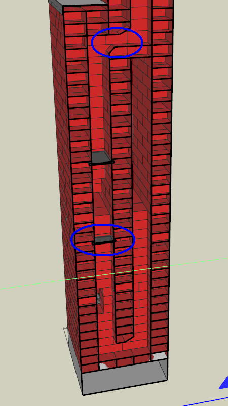 Непонятно зачем во втором ярусе сначала дымоход в кирпич, а потом снова в половинку - всюду должна быть одно сечение.