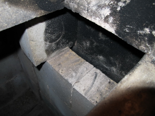 Сгорела даже сажа с кирпича на поду в конце камеры. Газы из горелки поднимаются до перекрытия, идут по перекрытию, затем по задней стенке и поду, закручиваясь в "клубок". Остывшие уходят в хайло справа-слева. Заметьте, выходы сделаны в 4 ряда и не доходят до перекрытия на один ряд. Как и в банной печи.