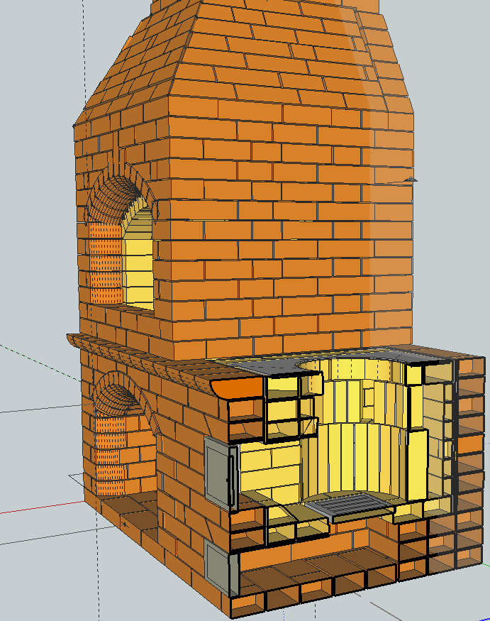У меня не профессиональная версия Google Sketchup в которой есть разрезы, поэтому я немного вручную разломал печку что бы показать её внутри.