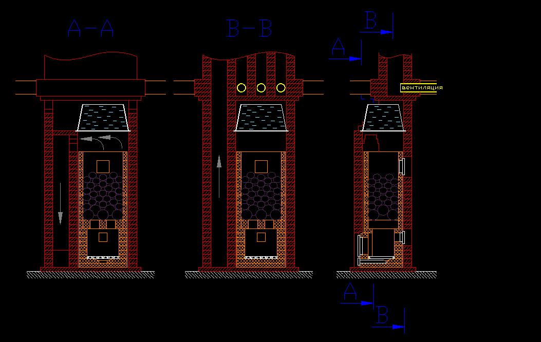 Внутренний шамотный корпус где находится топка и камни должен быть отдеоен зазором от внешнего облицовочного корпуса. В этом зазоре можно располагать дымовые каналы или каналы для охлаждения внутреннего армирования уголков и пр. (если такое предусмотрено проектом). Для бака с водой можно предусмотреть отдельный дымовой канал так как иногда нужна только вода, а иногда вода не нужна. Если есть задвижка регулирующая поступления тепла к баку с водой пользование баком упрощается. Также печь быстрее входит в рабочий режим и упрощается запуск печи. Задвижки в каменке, кроме одной самой верхней, лучше устанавливать внизу печи в холодных подвертках.