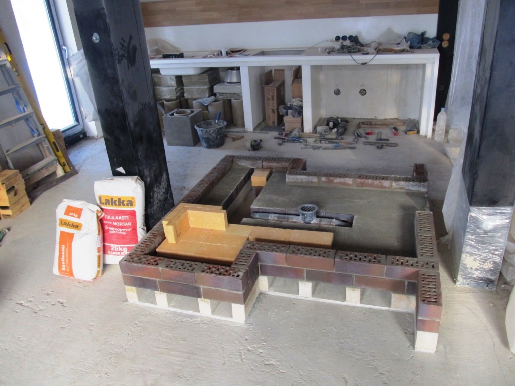 Добрый день! нужен совет! На фото под из пустотелого клинкера на бетонных шанцах. собран на глинянный раствор( на фото мешок слева).заполненные пустоты в кирпиче и 5мм выравнивающая стяжка из того же раствора. следующий этап- шамотное ядро. Для него закуплен спец. раствор(на фото справа).про стыки шамота все понятно- швы 2мм , зазор от облицовки итд. Вопрос: на что клеить под из шамота к клинкеру? так же на огнеупорный раствор или на глину? Если на глину , то неудобно работать сразу с двумя растворами : глина снизу и мастика в швах . !? если все на мастику: как у нее с прочностью? в этом месте низкая температура. мастика может не набрать прочность, а по проекту на шамот опирается дымоход. не уплывет мой пипелац?