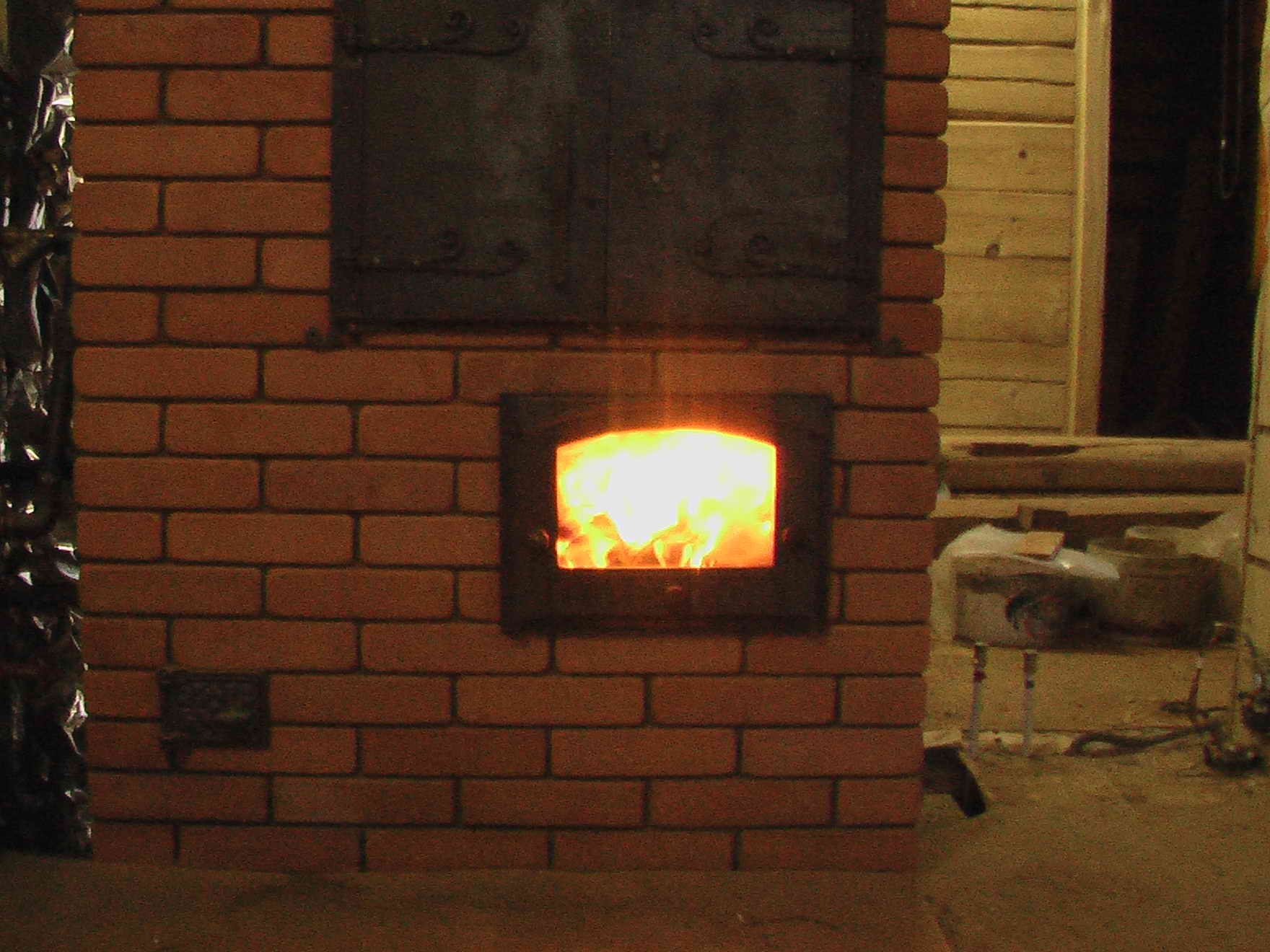 __Как и обещал, пишу о недостатках и проблемах печи. Кирпичи над обеими дверками сильно нагреваются, более 100. думаю, при такой тепл. нагрузке долго не продержатся, лопнут. Также и подпорные кирпичи плиты , выступающие в топливник. Надо бы сварить некие защитные кожухи. Других недостатков пока что не обнаружилось. Радостно топлю каждый день... чтоб рассаде тепло было.