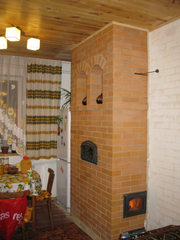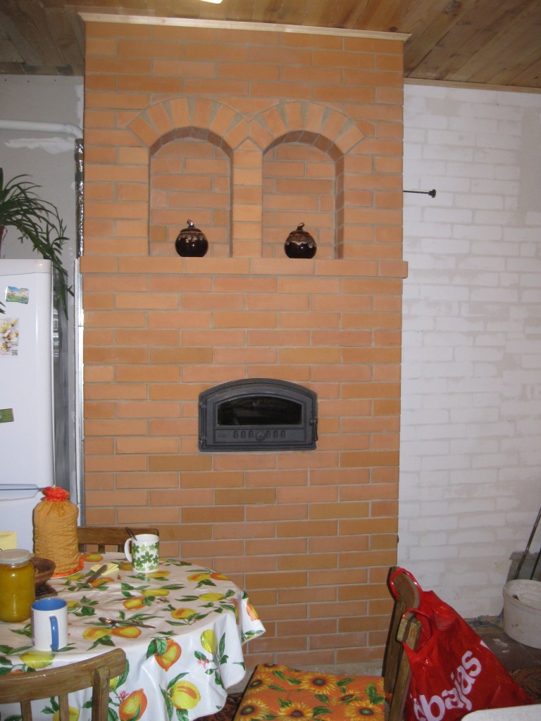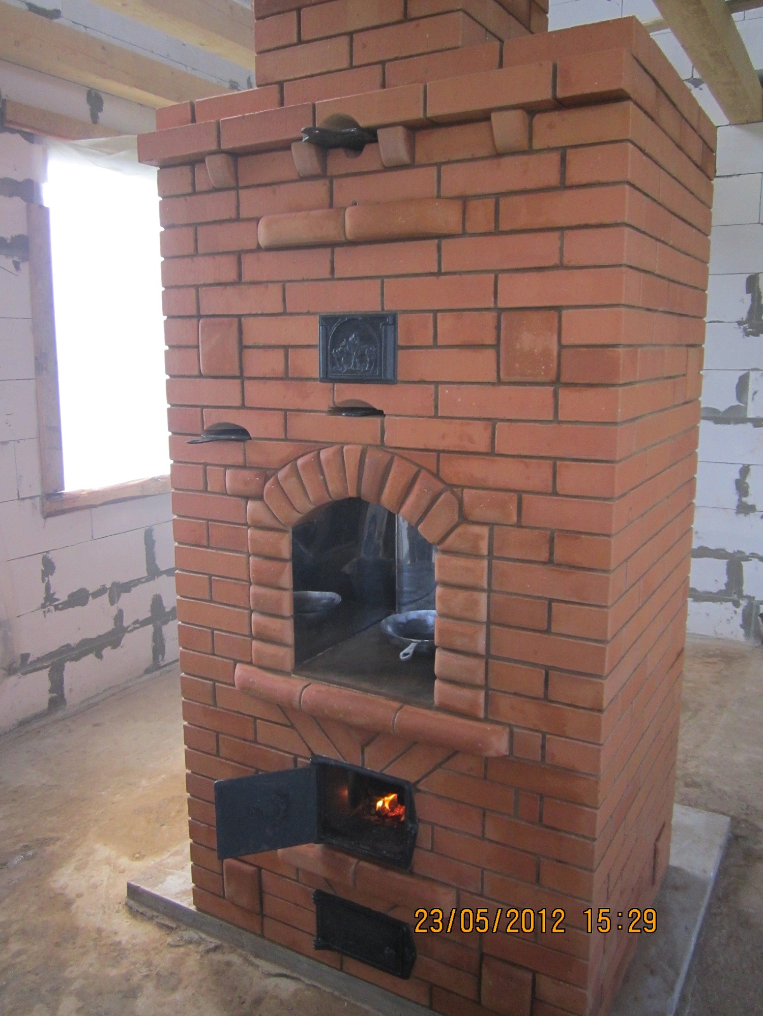 Относительно теплоотдачи. Сама печка хорошо нагревается, несмотря на то, что фасадная стенка из клинкерного кирпича разделена воздушной прослойкой от внутренней оболочки из огнеупорного кирпича. Правда, вот от водяного отопления я ожидал большего. Вода в системе нагревается где-то до 50 градусов. Батареи после затухания огня еще теплые около трех часов.
