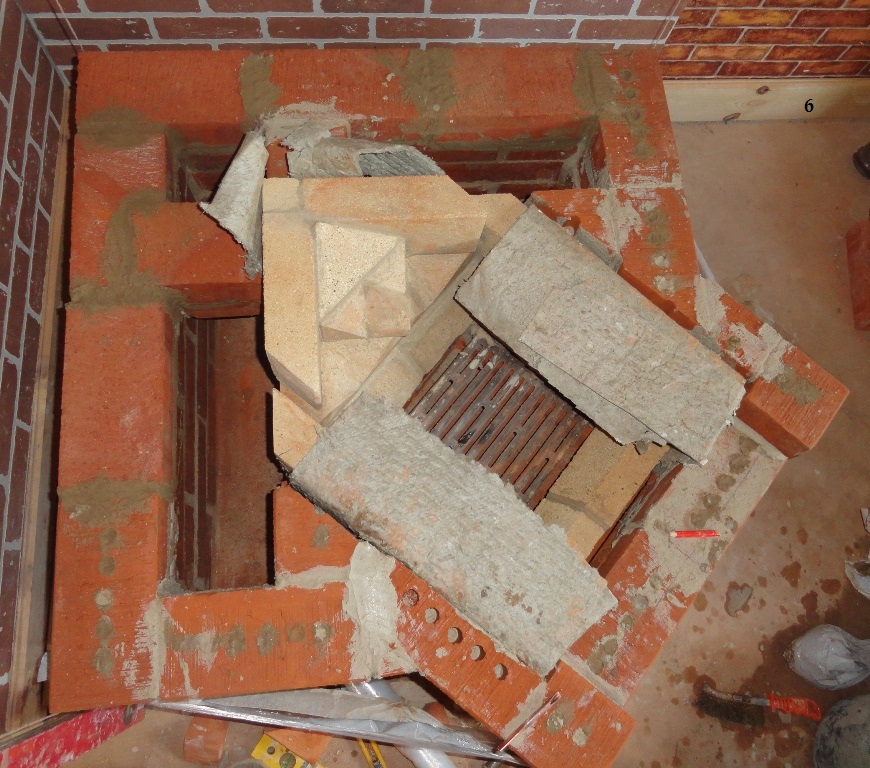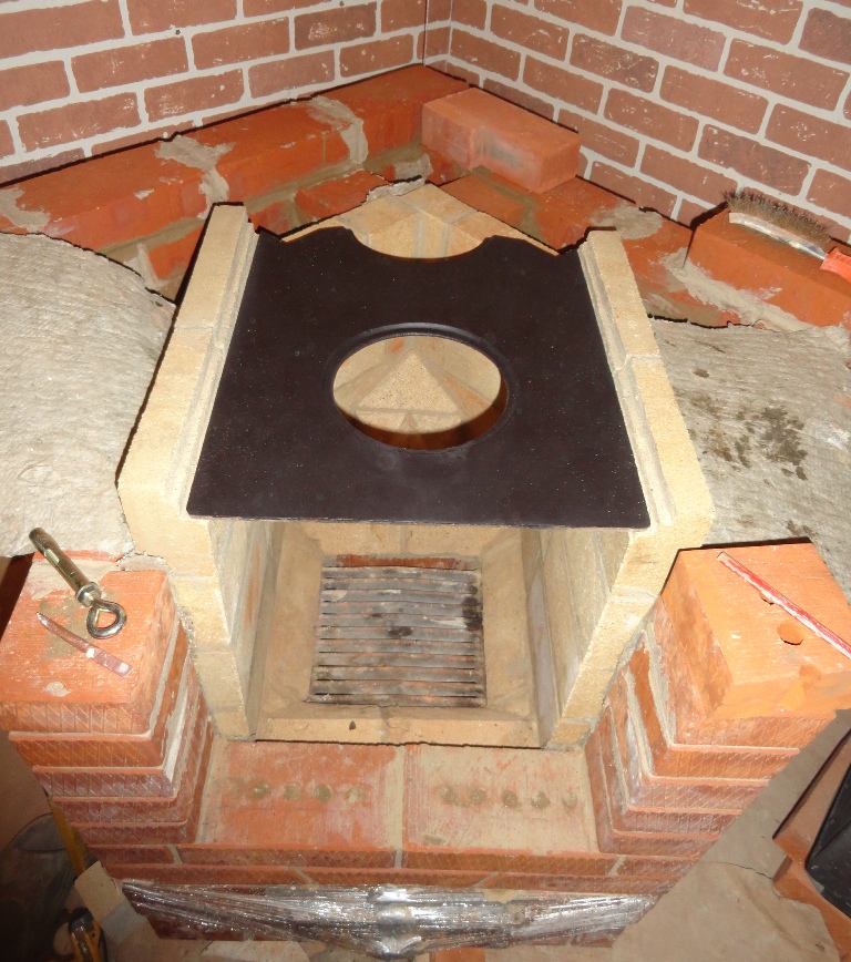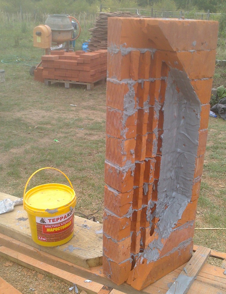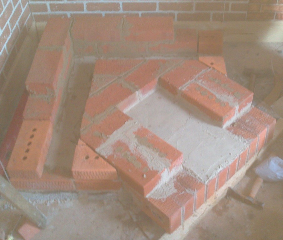 Дело в том, что большую дверцу можно было разместить либо углубив ее в сторону топки, как у В.Солина ХК угловая, либо выдвинув ее наружу. Я выбрал второй вариант, свой. Получилось что топочная сторона выступает таким зубом. А закрепить кирпич в таком положении нелегко, если фундамент без запаса - заподлицо - 3,5х3,5. Фундамент из блоков получился выше уровня пола. В общем придумал выложить нижний ряд топочной стороны на ребро (эдакой кирпичной балкой на 10 кирпичей), выпилить в кирпиче место под выступ фундамента так, чтобы высота оставшегося кирпича была равна высоте кирпича лежащего плашмя. Ну и собрать всю эту балку на стекловолоконную арматуру, т.к. она не особо расширяется от тепла как металл, ну и по идее она жаропрочна как и стекловолокно. Склеить балку я решил готовой мастикой того же Терракота.