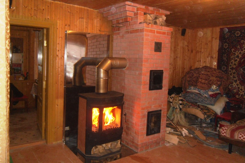 Полноценная печь, часть которой прогревается и буржуйкой. Для дополнительной утилизации тепла на 2 этаже шиток. |