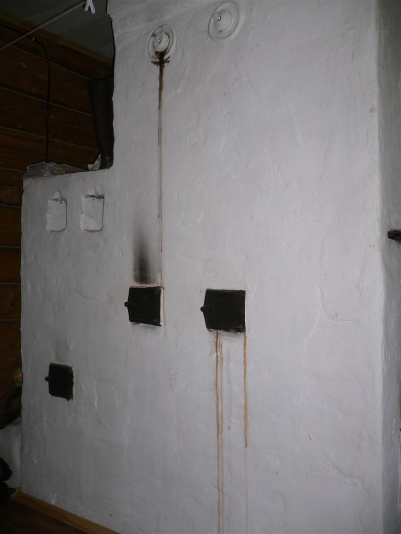 Вообще-то печь не дымит, тяга хорошая, эксплуатируется с осени по раннюю весну с периодичностью от двух дней в неделю до двух дней в две-три недели. В русской печи готовим раз в 2-3 недели круглый год. Подтёки на печи двухгодичной давности, когда сдуру топил сырыми дровами.