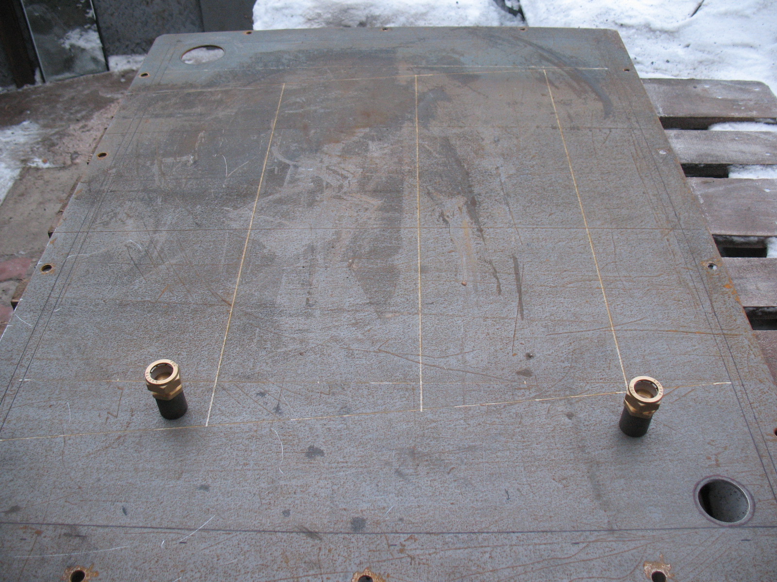| Передняя стенка котла. Внутренняя сторона. Размечена для приварки оставшихся ребер жесткости. Бобышки - для крепления гофротрубы контура ГВС. |