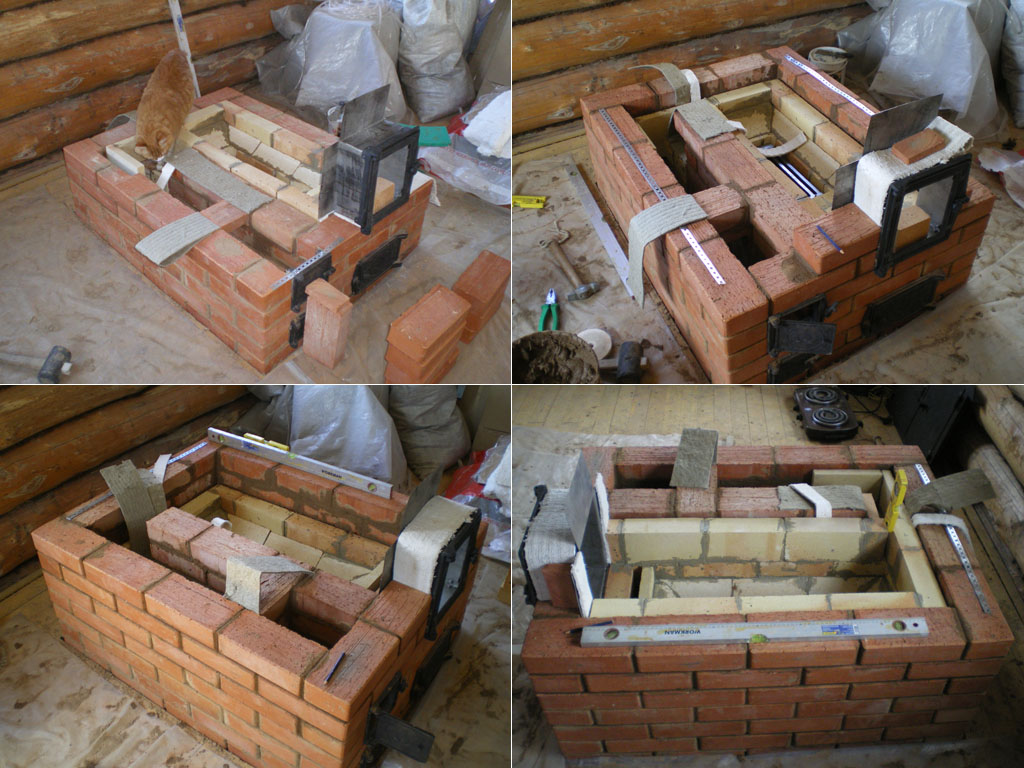 Нихромовую (не отожжённую!) проволоку диаметром 1,8-2 мм (а не вязальною стальную даже оцинкованную проволоку), которая крепит чугунные дверцы в кладке, гораздо лучше закладывать в кладку не в виде одиночной проволоки, а в виде скрутки из 2-х проволок ("косички", плотно и аккуратно свитой из сложенной пополам проволоки), которую из кладки вырвать просто нереально. На концах этой скрутки концы (усики) загибаются назад пассатижами или плоскогубцами и приобретают вид двойного рыболовного крючка или гарпуна. Эти усики в кладочном растворе разогнуть нереально.