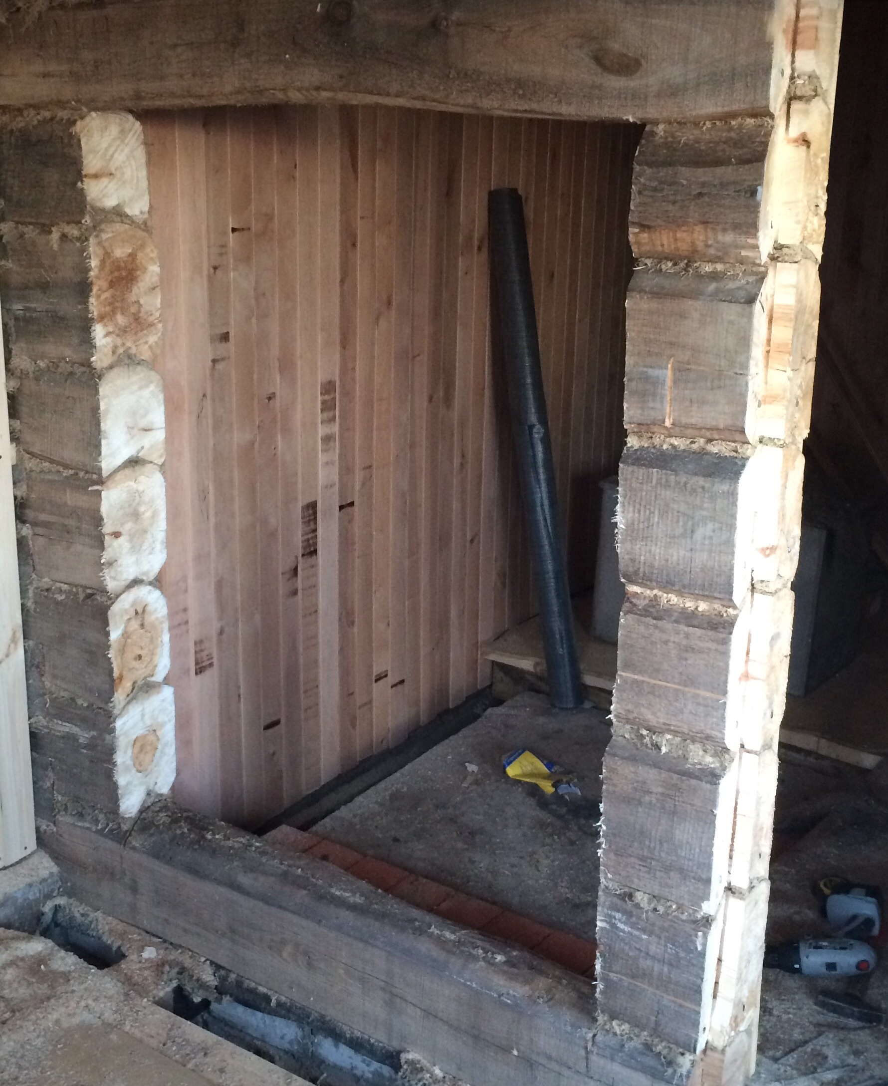 Проём у Вас между предбанником и парной, для портала топливника ? И правее дверной проём? Надо срочно косяки дверные ставить, или брусок в паз простенка вставлять...По- моему.