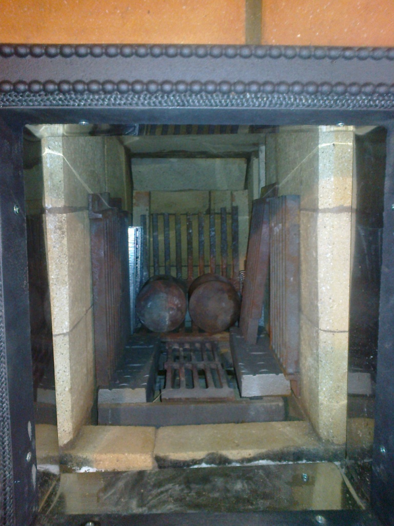 В каменке сделано 2 ХХ по задней стенке и перед дверкой, по бокам вертикально поставлены чугунные колосники для лучшего прогрева камней по всей высоте и защиты кладки от распора.