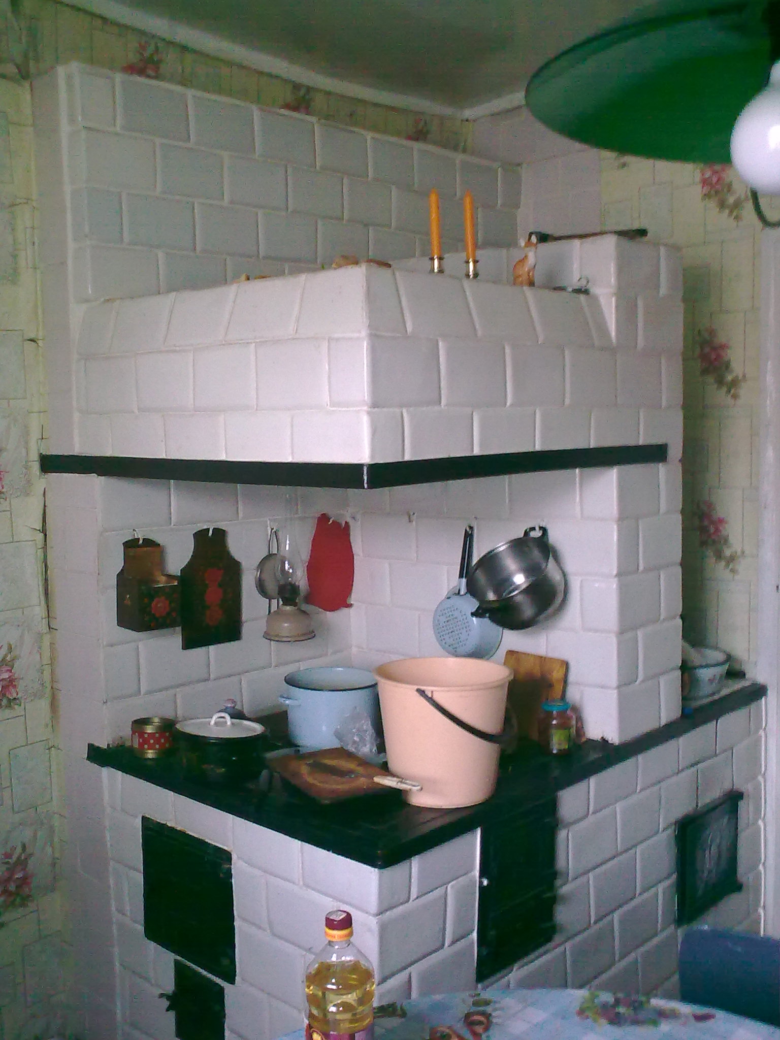 Вот нашел еще один снимочек печи. Это не для рекламы, потому как кафель использовался старый, оставшийся от разборки старой печи, а потому не высокого качества. Кроме того печь покрашена масляной краской , что заметно по темным пятнам из-за перенакала печи.