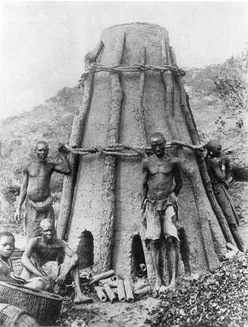 | ВЫСОКАЯ ПЕЧЬ для получения железа, построенная народом фипа в Танзании. Под шахтой, сооруженной из глины, находится большая яма. Глиняные трубки у основания шахты (фурмы), служили для подачи в печь воздуха. Такие печи, впервые появившиеся в Центральной Африке в VII в. до н. э., использовались в некоторых районах и в 1914 г. Фотография, сделанная бельгийским этнографом Р.П. Уикертом, относится именно к этому времени. |