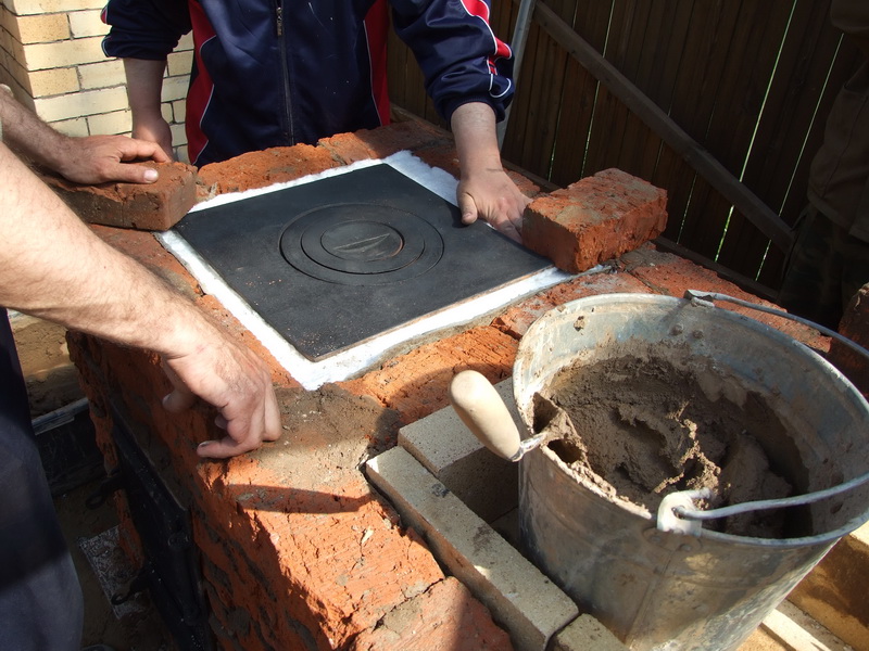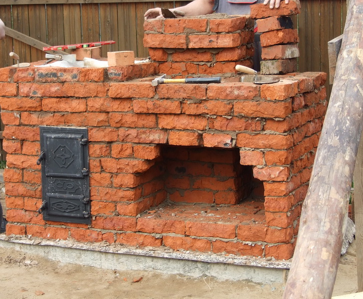Подготовленную площадку выравниваем раствором, поскольку кирпич по геометрии желает лучшего, а над топочной дверцей поднимаем два три ряда для определения размеров топки и расположения варочного настила.