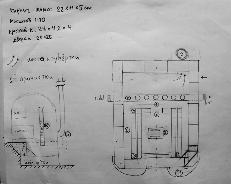 Здравствуйте! Спасибо за помощь! По ХК с ее подом, и каналам ВВ, я вроде все понял. Подемный канал для дыма, с зади печи, тот о котором вы сказали узок, может быть любой, так как назад я могу увеличивать его как угодно, мах размер печи в этом направлении 170 см, а на схеме 120-130 см, подскажите сколко оптимально, я так и сделаю. А по хайлу, и СШ, я так до конца не понял, как и где делать СШ, где хайло, какие размеры оптимальны? И главное локализация оных на задней стенке топки. Зарание благодарю! с ув. А.
