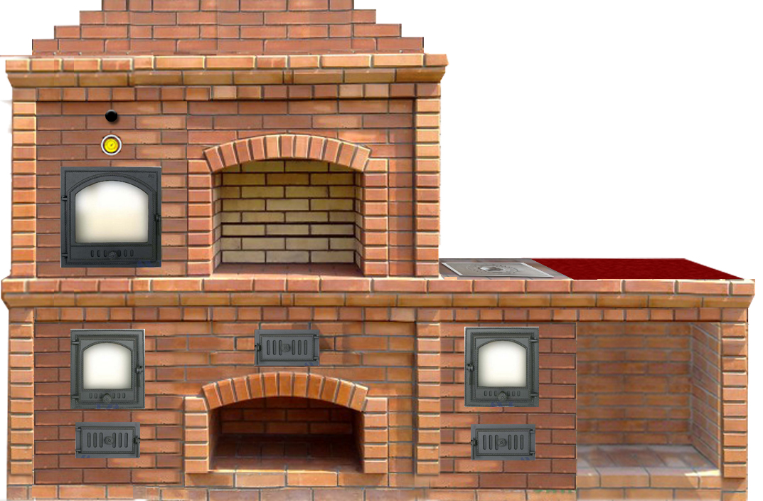 Да.. Я тут неточность обнаружил на своём эскизе. Варочная поверхность, её рабочая часть, должна находится на одном уровне с декоративным выступом, идущим горизонтально через весь комплекс. Ну и, соответственно, топочная дверца варочной плиты - в одной плоскости с топочной дверцей духовки.