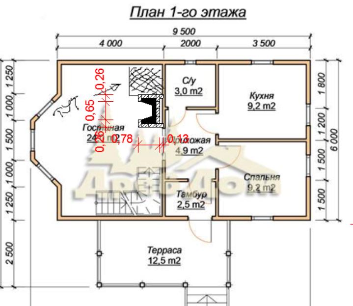 Заказчик чётко указал расположение фундамента,так что предложение о не угловом камине просто не подходит,да и расположение у двери не очень.