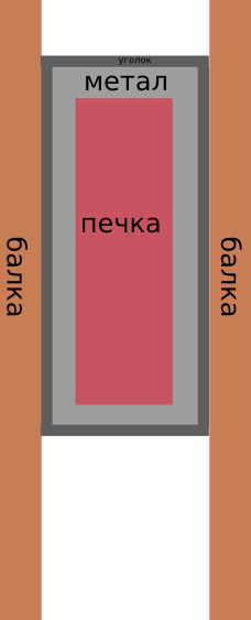 Потому, что думаю на деревянные балки перекрытия прикручивать уголок, а на него ложить какой-то лист метала и заполнять это пространство вокруг распушки чем-то негорючим (керамзит к примеру).