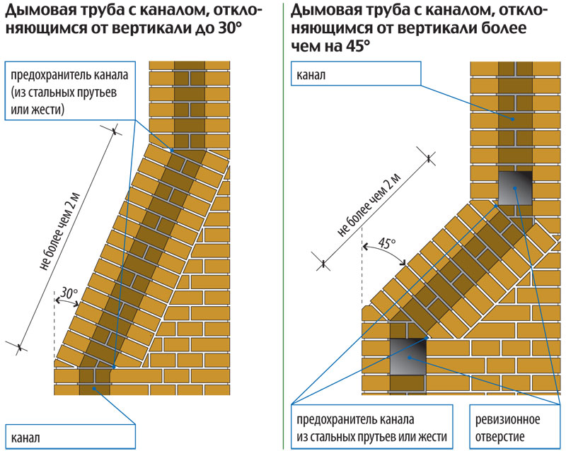 СП - при проектировании и монтаже "дымовые трубы должны быть вертикальными без уступов из глиняного кирпича со стенками толщиной не менее 120 мм или из жаростойкого бетона толщиной не менее 60 мм, при этом допускается предусматривать отводы труб под углом до 30° к вертикали с относом не более 1 м.