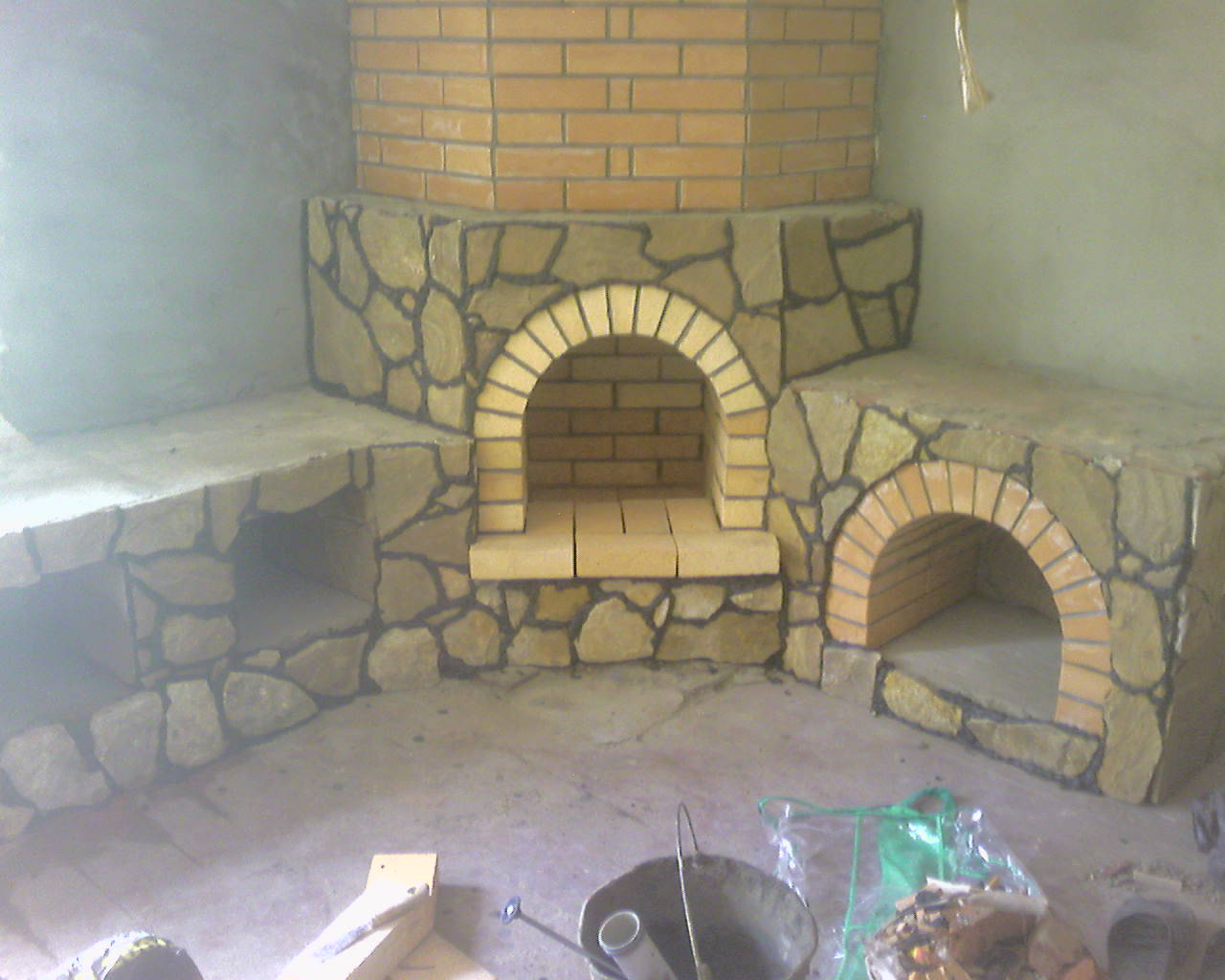 Массив камина из пеноблоков,топка и дымосборник шамот,короб гипсокартон.